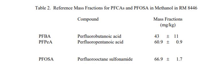 PFCA 和 PFOSA 的參考質(zhì)量分?jǐn)?shù):表 1 中給出了參考質(zhì)量分?jǐn)?shù)值甲醇中的 PFCA 和表 2 中甲醇中的 PFCA 和 PFOSA。這些值基于從溶液的重量法制備獲得的結(jié)果和使用液相色譜法確定的分析結(jié)果。參考值是對(duì)真實(shí)值的最佳估計(jì)的非認(rèn)證值;但是,這些值不符合 NIST 認(rèn)證標(biāo)準(zhǔn),并且提供了可能反映的相關(guān)不確定性?xún)H測(cè)量精度,可能不包括所有不確定性來(lái)源,或者可能反映多種分析方法之間缺乏足夠的統(tǒng)計(jì)一致性 [1]。