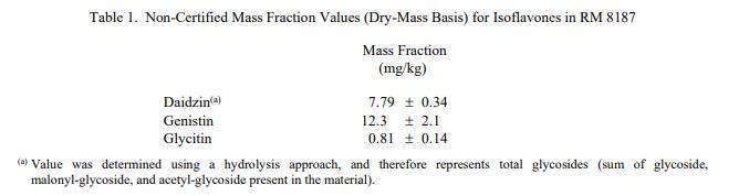 RM 8187 中異黃酮(作為總糖苷)的非認(rèn)證質(zhì)量分?jǐn)?shù)值見表 1。總蛋白質(zhì)量分?jǐn)?shù)值 (%) 的非認(rèn)證值見表 1。表 2. 非認(rèn)證值是根據(jù)現(xiàn)有數(shù)據(jù)對真實值的最佳估計;但是,這些值不符合 NIST 認(rèn)證標(biāo)準(zhǔn) [1],并且提供了相關(guān)的不確定性,這些不確定性可能僅反映測量再現(xiàn)性,可能不包括所有不確定性來源,或者可能反映多種分析方法之間缺乏足夠的統(tǒng)計一致性。賦值分析由 NIST 進(jìn)行,非認(rèn)證值計算為 NIST 方法平均值的等權(quán)重平均值。相關(guān)的不確定性以 95% 的置信水平表示 [2-4]。以質(zhì)量分?jǐn)?shù)單位 [5] 以干質(zhì)量為基礎(chǔ)報告值。非認(rèn)證值可追溯到 NIST 或合同實驗室使用的測量過程和標(biāo)準(zhǔn)