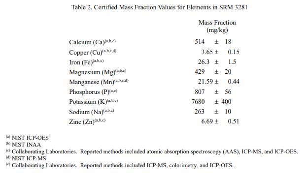 表 1 和表 2 中提供了以干質(zhì)量為基礎報告的奎尼酸和元素的認證質(zhì)量分數(shù)值。NIST 認證值是 NIST 對其準確性有最高置信度的值所有已知或可疑的偏差來源都已被考慮在內(nèi) [1]。價值分配分析由 NIST 和合作實驗室進行。認證值計算為