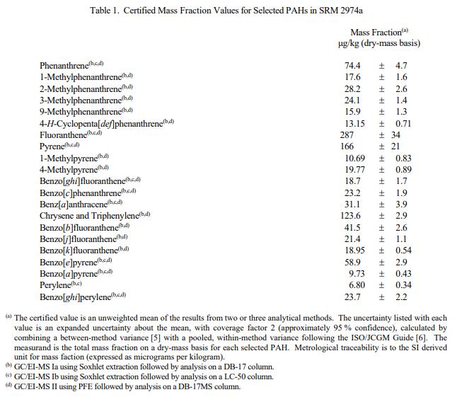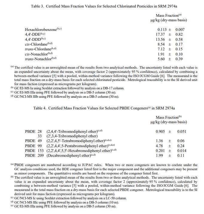 表 6 中提供了 8 種額外多環(huán)芳烴的參考值,表 7 中提供了 14 種額外 PCB 同族物(一些組合)的參考值,表 8 中提供了 8 種額外 PBDE 同族物和 2 六溴環(huán)十二烷的參考值異構(gòu)體。參考值是未經(jīng)認(rèn)證的值,是對真實(shí)值的估計(jì);然而,這些值不符合 NIST 的認(rèn)證標(biāo)準(zhǔn),并且提供了相關(guān)的不確定性,這些不確定性可能僅反映測量精度,可能不包括所有不確定性來源,或者可能反映多種分析方法之間缺乏足夠的統(tǒng)計(jì)一致性 [1]。