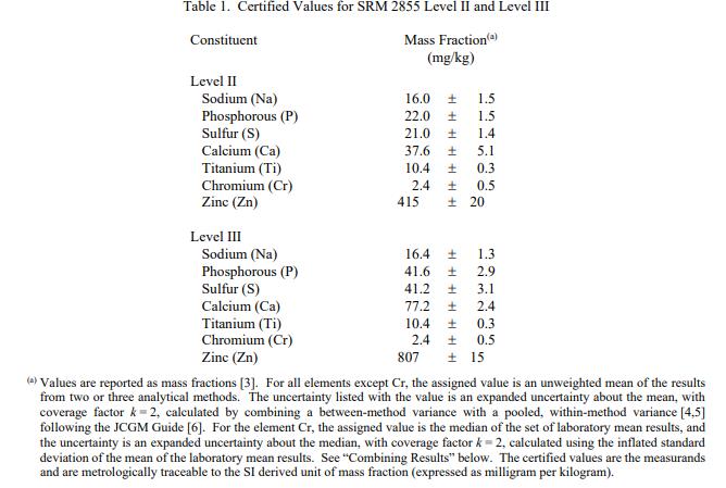 表 1 報(bào)告了 SRM 2855 II 級和 III 級成分的認(rèn)證值。賦值類別基于 NIST 用于化學(xué)參考材料的術(shù)語和模式的定義 [1]。 NIST 認(rèn)證值是 NIST 對其準(zhǔn)確性有最高置信度的值,因?yàn)樗幸阎蚩梢傻钠顏碓炊家驯徽{(diào)查或考慮在內(nèi)。認(rèn)證值根據(jù) NIST 和合作實(shí)驗(yàn)室使用儀器測試方法進(jìn)行的分析結(jié)果,提供對真實(shí)值的最佳估計(jì)。