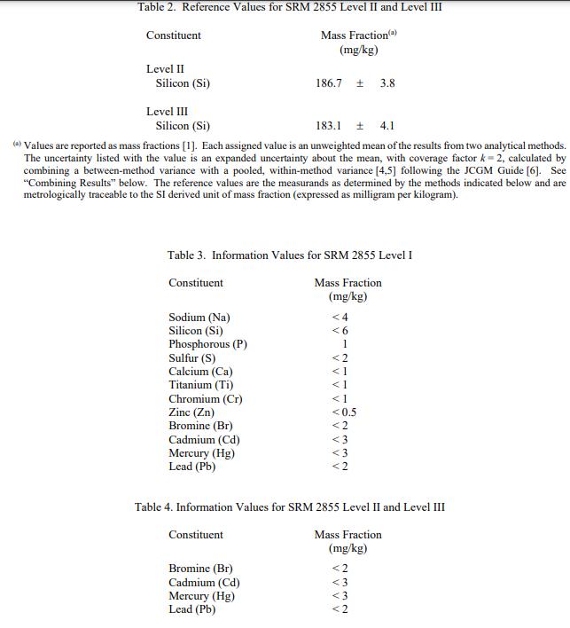 表 2 中報(bào)告了 SRM 2855 Level II 和 Level III 的參考值。