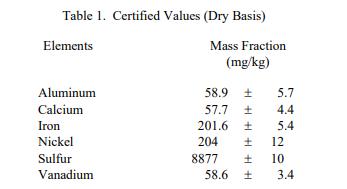 表 1 中提供了認證值,以干基的質量分數(shù) [1] 表示。NIST 認證值是 NIST 對其準確性有最高置信度的值,因為所有已知或可疑來源NIST 已經(jīng)調查或解釋了偏差。鋁、鈣、鐵、鎳和釩的認證值基于兩種獨立的 NIST 方法。硫的認證值基于單一的 NIST 主要方法。