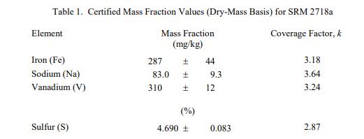 表 1 中提供了鐵、鈉、硫和釩的認(rèn)證值,以基于干質(zhì)量的質(zhì)量分?jǐn)?shù) [1] 表示。NIST 認(rèn)證值是 NIST 具有最高的值對其準(zhǔn)確性的信心,因?yàn)樗幸阎蚩梢傻钠顏碓炊家驯徽{(diào)查或考慮 [2]。認(rèn)證值是對真實(shí)值的當(dāng)前最佳估計(jì)。