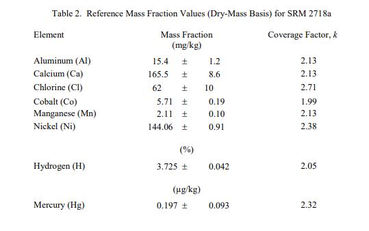 表 2 中提供了鋁、鈣、氯、鈷、氫、汞、錳和鎳的參考值,以基于干質(zhì)量的質(zhì)量分?jǐn)?shù) [1] 表示。參考值是對真實(shí)價值的最佳估計(jì)的非核證價值;但是,該值不符合 NIST 的認(rèn)證標(biāo)準(zhǔn),并且提供了相關(guān)的不確定性,該不確定性可能僅反映測量精度,可能不包括所有不確定性來源 [2]。
