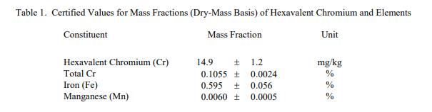 表 1 提供了 SRM 2700 中基于干質(zhì)量的六價(jià)鉻、總鉻、鐵和錳的認(rèn)證質(zhì)量分?jǐn)?shù)。認(rèn)證值基于經(jīng)過嚴(yán)格評估的獨(dú)立分析技術(shù)。 NIST 認(rèn)證值是 NIST 對其準(zhǔn)確性具有最高置信度的值,因?yàn)樗幸阎蚩梢傻钠顏碓炊家驯徽{(diào)查或考慮在內(nèi) [1]。被測量是表 1 中報(bào)告的元素的質(zhì)量分?jǐn)?shù)。計(jì)量溯源性為質(zhì)量的 SI 單位,以質(zhì)量分?jǐn)?shù)表示。