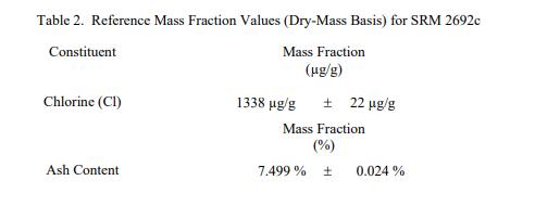 表 2 中提供了氯和灰分含量 [6,7] 的參考值,以基于干質(zhì)量的質(zhì)量分數(shù) [1] 表示。氯的參考值基于使用NIST 技術(shù)?;曳趾康膮⒖贾祷?CANSPEX 計劃與 NIST 合作提供的數(shù)據(jù)。參考值是非認證值,是對真實值的當前最佳估計;但是,這些值不符合 NIST 的認證標準,并且提供了相關(guān)的不確定性,這些不確定性可能僅反映測量精度,可能不包括所有不確定性來源 [2]。每個值列出的不確定度是基于 95% 置信區(qū)間的擴展不確定度,并根據(jù)ISO/JCGM 指南 [4,5] 中的方法。