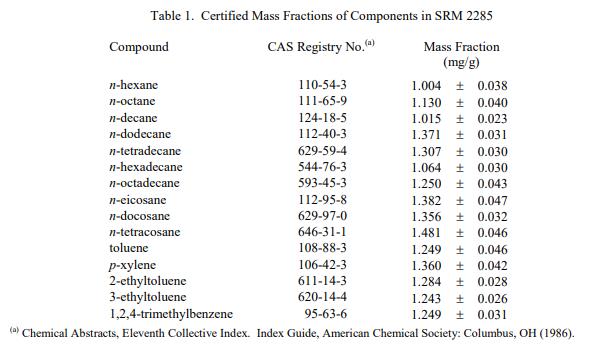 表 1 中給出了 15 種成分的認證值。這些值是基于從該溶液的重量法制備中獲得的結(jié)果以及使用氣相色譜法確定的分析結(jié)果。 NIST 認證值是 NIST 具有最高的值對其準確性的信心,因為所有已知或可疑的不確定性來源都已調(diào)查或考慮在內(nèi) [1]。