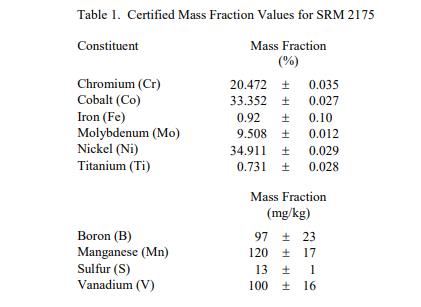 參考質(zhì)量分?jǐn)?shù)值在表 2 [1] 中提供。參考值是非認(rèn)證值,是對(duì)真實(shí)值的當(dāng)前最佳估計(jì);然而,這些值不符合 NIST 的認(rèn)證標(biāo)準(zhǔn),并且提供了相關(guān)的不確定性,這些不確定性可能僅反映測(cè)量精度,可能不包括所有不確定性來源,或者可能反映多種分析方法之間缺乏足夠的一致性 [2]。