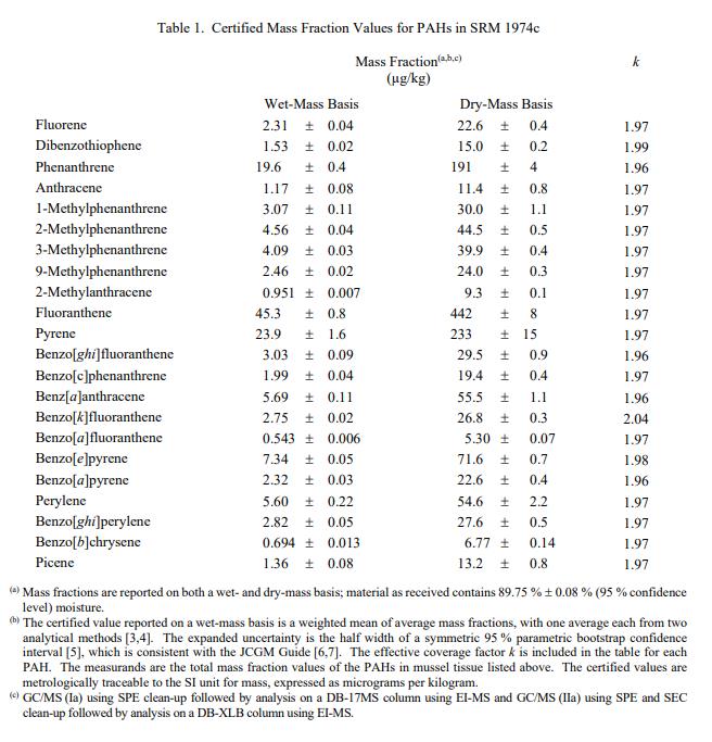 提供了 PAH(表 1)、PCB 同族物(表 2)、氯化農(nóng)藥(表 3)、PBDE 同族物(表 4)以及汞和錫的認(rèn)證質(zhì)量分?jǐn)?shù)值物種(表 5)。 NIST 認(rèn)證值是 NIST 對(duì)其準(zhǔn)確性具有最高置信度的值,因?yàn)樗幸阎蚩梢傻钠顏?lái)源都已被調(diào)查或考慮在內(nèi) [1]。認(rèn)證值基于 NIST 使用多種分析技術(shù)獲得的結(jié)果的一致性。