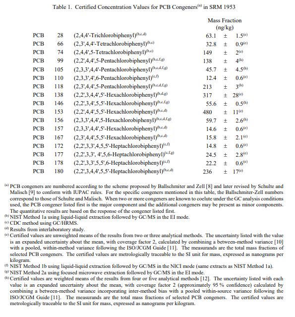 表 1、2 和 3 分別提供了 PCB 同系物、氯化農(nóng)藥和 PBDE 同系物以及多溴聯(lián)苯同系物的濃度認(rèn)證值,以質(zhì)量分?jǐn)?shù)表示。 NIST 認(rèn)證值是 NIST 對(duì)其準(zhǔn)確性具有最高置信度的值,因?yàn)樗幸阎蚩梢傻钠顏碓炊家驯徽{(diào)查或考慮在內(nèi) [1]。經(jīng)認(rèn)證的pCB 同系物、氯化農(nóng)藥和 PBDE 同系物的值基于 NIST 使用一種或多種分析技術(shù)獲得的結(jié)果與 CDC 和使用不同分析技術(shù)的實(shí)驗(yàn)室間研究的額外結(jié)果的一致性。