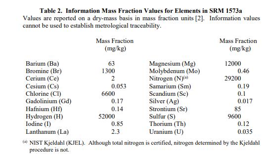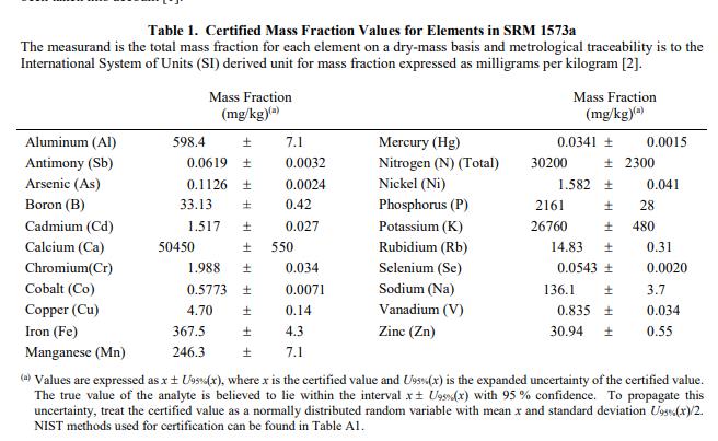 一個 SRM 1573a 單元由 50 克干番茄葉組成。認(rèn)證的質(zhì)量分?jǐn)?shù)值:認(rèn)證的質(zhì)量分?jǐn)?shù)值在表 1 中提供。 NIST 認(rèn)證值是 NIST 對其準(zhǔn)確性有最高置信度的值,因為所有已知或可疑的偏差來源都已被考慮在內(nèi)