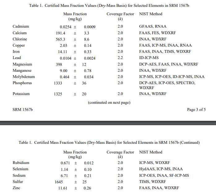 表 1 提供了 SRM 1567b 中選定元素的認(rèn)證質(zhì)量分?jǐn)?shù)值。 NIST 認(rèn)證值是 NIST 對(duì)其準(zhǔn)確性的最高置信度的值,因?yàn)樗幸阎蚩梢傻钠顏碓炊家颜{(diào)查或考慮[1]。以質(zhì)量分?jǐn)?shù)單位 [2] 以干質(zhì)量為基礎(chǔ)報(bào)告值。