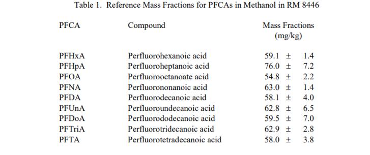 PFCA 和 PFOSA 的參考質(zhì)量分?jǐn)?shù):表 1 中給出了參考質(zhì)量分?jǐn)?shù)值甲醇中的 PFCA 和表 2 中甲醇中的 PFCA 和 PFOSA。這些值基于從溶液的重量法制備獲得的結(jié)果和使用液相色譜法確定的分析結(jié)果。參考值是對(duì)真實(shí)值的最佳估計(jì)的非認(rèn)證值;但是,這些值不符合 NIST 認(rèn)證標(biāo)準(zhǔn),并且提供了可能反映的相關(guān)不確定性?xún)H測(cè)量精度,可能不包括所有不確定性來(lái)源,或者可能反映多種分析方法之間缺乏足夠的統(tǒng)計(jì)一致性 [1]。
