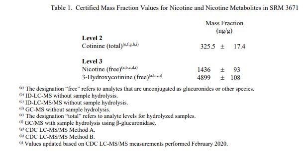 表 1 提供了尼古丁、可替寧和 3-羥基可替寧的認(rèn)證值。NIST 認(rèn)證值是 NIST 對(duì)其準(zhǔn)確性有最高置信度的值,因?yàn)樗幸阎蚩梢傻钠顏?lái)源都已調(diào)查或考慮[1]。認(rèn)證值基于 NIST 使用同位素稀釋液相色譜質(zhì)譜 (ID-LC-MS) 測(cè)量的結(jié)果,同位素采用串聯(lián)質(zhì)譜法 (ID-LC-MS/MS)、氣相色譜質(zhì)譜法 (GC-MS) 的稀釋液相色譜法,以及在疾病控制和預(yù)防中心 (CDC) 使用 ID-LC-MS/MS 方法進(jìn)行的測(cè)量.