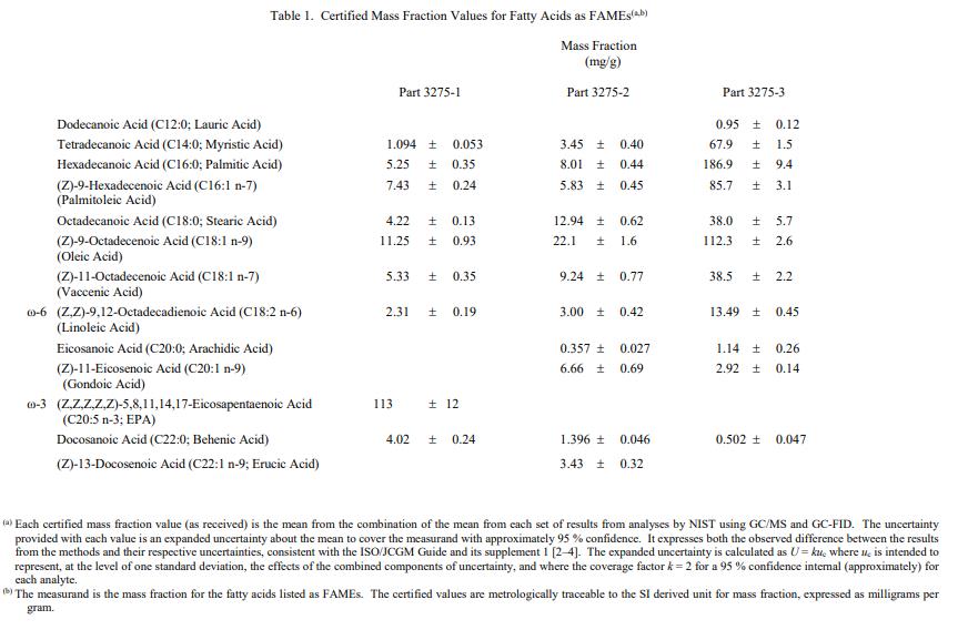 表 1 中提供了脂肪酸的認證質(zhì)量分數(shù)值。NIST 認證值是 NIST 對其準確性有最高置信度的值,因為所有已知或可疑的偏差來源都已被調(diào)查或采用考慮[1]。 NIST 使用兩種獨立的方法對賦值進行了分析。所有認證值均計算為每個平均值的平均值方法。相關(guān)的不確定性以 95% 的置信水平表示 [2-4]。值以質(zhì)量分數(shù)單位 [5] 以收到的形式報告。