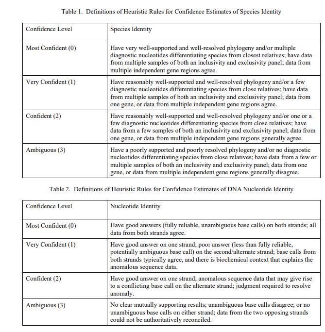 分類學特征是 Camellia sinensis,由經(jīng)過培訓的植物學家使用來自原始材料的植物標本和來自植物學認證的 Camellia sinensis 的相關(guān) DNA 序列分析確定。相關(guān)的 DNA 序列可在伴隨的 FASTA 格式文件中找到 [1]。與序列中每個核苷酸相關(guān)的不確定性,以及與作為物種標識符的 DNA 序列相關(guān)的不確定性,以表示規(guī)定值的置信度估計的序數(shù)標度表示(表 1 和表 2)[2] .這些 DNA 序列被用作 Camellia sinensis 的身份數(shù)據(jù)來源。