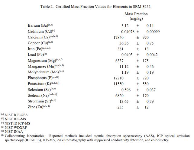 表 1 至表 3 中提供了 SRM 3252 中膽固醇、元素和維生素的認(rèn)證質(zhì)量分?jǐn)?shù)值,以干質(zhì)量為基礎(chǔ)報告。NIST 認(rèn)證值是 NIST 認(rèn)證的值對其準(zhǔn)確性的信心最高,因為所有已知或可疑的偏差和可變性來源都已考慮在內(nèi) [1]。價值分配分析由 NIST 和合作實驗室進(jìn)行。認(rèn)證值計算為 NIST 方法的平均值和合作實驗室提供的平均結(jié)果的中位數(shù)(在適當(dāng)?shù)那闆r下)。相關(guān)的不確定性以大約 95% 的置信水平表示 [2-4]。