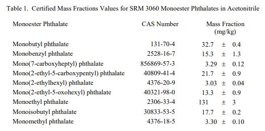 表 1 中列出的鄰苯二甲酸單酯的認(rèn)證質(zhì)量分?jǐn)?shù)值基于該溶液的重量法制備結(jié)果和使用液相色譜法 (LC) 確定的分析結(jié)果 [1,2]。 NIST 認(rèn)證值是 NIST 具有最高的值