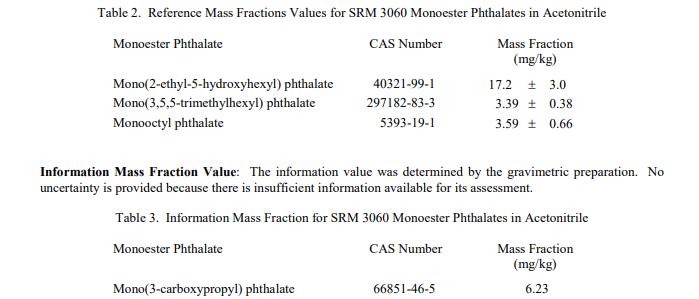 表 2 中列出的鄰苯二甲酸單酯的參考質(zhì)量分?jǐn)?shù)值是基于從溶液的重量法制備和使用液相色譜法確定的分析結(jié)果獲得的結(jié)果。參考值是對(duì)真實(shí)值的最佳估計(jì)值;然而,這些值不符合 NIST 認(rèn)證標(biāo)準(zhǔn),并且提供了相關(guān)的不確定性,這些不確定性可能僅反映測量精度,可能不包括所有不確定性來源,或者可能反映多種分析方法之間缺乏足夠的統(tǒng)計(jì)一致性 [1]。