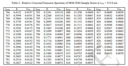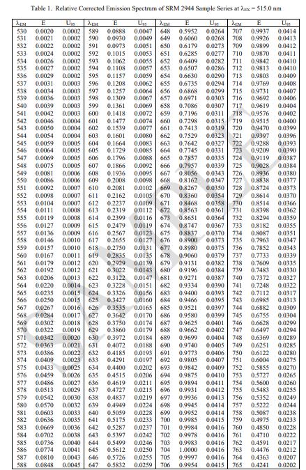 NIST 認(rèn)證值是 NIST 對其準(zhǔn)確性有最高置信度的值,因?yàn)樗幸阎蚩梢傻钠顏碓炊家颜{(diào)查或考慮在內(nèi) [1]。每個(gè)發(fā)射波長的 E 和相應(yīng)總不確定度在 95 % 置信水平 U95 下的認(rèn)證值在表 1 和表 2. E 的計(jì)量溯源性是 NIST 光譜輻射度標(biāo)度,以相對能量單位表示。波長的計(jì)量溯源性為米的 SI 單位。