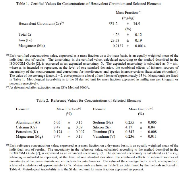 表 1 給出了 SRM 2701 中六價(jià)鉻、總鉻、鐵和錳的認(rèn)證濃度。NIST 認(rèn)證值是 NIST 在所有已知或可疑來(lái)源中對(duì)其準(zhǔn)確性有最高置信度的值偏見(jiàn)已經(jīng)被調(diào)查或考慮[1]。認(rèn)證值基于兩種或多種獨(dú)立分析方法的結(jié)果一致。六價(jià)鉻的認(rèn)證值是 NIST 和三個(gè)合作實(shí)驗(yàn)室進(jìn)行的分析測(cè)量的未加權(quán)平均值。該值基于使用經(jīng)批準(zhǔn)的美國(guó)環(huán)境保護(hù)署 (EPA) SW-846 分析方法(方法 3060A)從材料中提取的六價(jià)鉻,所有參與實(shí)驗(yàn)室均使用該方法。總鉻和鐵的認(rèn)證值是 NIST 三種獨(dú)立分析方法結(jié)果的未加權(quán)平均值。錳的認(rèn)證值是 NIST 兩種獨(dú)立分析方法結(jié)果的未加權(quán)平均值。