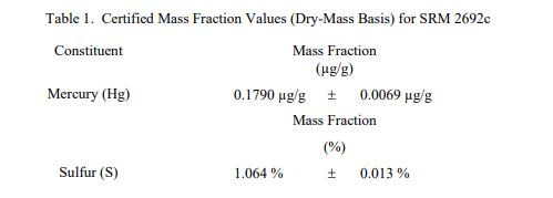 表 1 中提供了硫和汞的認證值,以基于干質(zhì)量的質(zhì)量分數(shù) [1] 表示。NIST 認證值是 NIST 對其準確性有最高置信度的值所有已知或可疑的偏差來源都已被調(diào)查或考慮 [2]。認證值是對真實值的當前最佳估計。硫的認證值基于加權(quán)最小