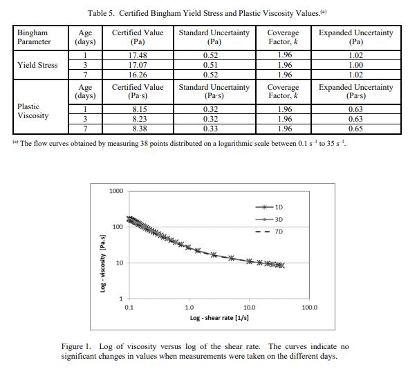 NIST 認(rèn)證值是 NIST 對其準(zhǔn)確性有最高置信度的值,并且所有已知或可疑的偏差來源都已調(diào)查或考慮在內(nèi) [1]。經(jīng)認(rèn)證的 Bingham 屈服應(yīng)力和塑性粘度值在表 1 中給出,并且是基于在 NIST 由單個(gè)操作員使用平行鋸齒板流變儀進(jìn)行的分析測量結(jié)果。粘度與剪切的完整曲線