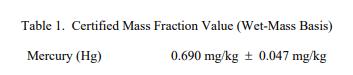 表 1 中提供了汞的認(rèn)證值,表示為基于濕質(zhì)量(原樣)的質(zhì)量分?jǐn)?shù) [1]。該值基于使用冷蒸氣同位素稀釋的主要方法進(jìn)行的分析電感耦合等離子體質(zhì)譜 (CV-ID-ICP-MS) [2,3]。 NIST 認(rèn)證值是 NIST 對(duì)其準(zhǔn)確性具有最高置信度的值,因?yàn)樗幸阎蚩梢傻钠顏?lái)源都已被調(diào)查或考慮 [4]。認(rèn)證值的不確定度以擴(kuò)展不確定度的形式給出,以大約 95% 的置信度覆蓋被測(cè)量。擴(kuò)展的不確定性計(jì)算為 U = kuc 其中uc 是與 ISO/JCGM 指南 [5] 一致的組合不確定度,k 是對(duì)應(yīng)于大約 95% 置信度的覆蓋因子 (k = 2)。被測(cè)量是表 1 中列出的汞的總質(zhì)量分?jǐn)?shù)。計(jì)量可溯源至 SI 派生的質(zhì)量分?jǐn)?shù)單位(以毫克每千克表示)