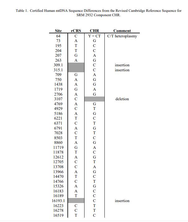NIST 認(rèn)證值是 NIST 對(duì)其準(zhǔn)確性有最高置信度的值,因?yàn)?NIST 已調(diào)查或說(shuō)明了所有已知或可疑的偏差來(lái)源。此 SRM 經(jīng)認(rèn)證可用于來(lái)自兩個(gè)類(lèi)淋巴母細(xì)胞培養(yǎng)系(CHR 和 GM09947A)的整個(gè)人類(lèi) mtDNA(16 569 個(gè)堿基對(duì))的序列以及包含 C-stretch 的 CHR 的克隆 HV1 區(qū)域。表 1 包含與 CHR 組件 [1] 的修訂劍橋參考序列 (rCRS) 的序列差異。表 2 包含組件 GM09947A 與 rCRS 的序列差異。表 3 包含成分 CHR 的克隆 HV1 區(qū)域與 rCRS 的序列差異。