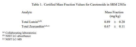 表 1 和表 2 中提供了 SRM 2383a 中類胡蘿卜素和元素的認(rèn)證質(zhì)量分?jǐn)?shù)值,按原樣報(bào)告。NIST 認(rèn)證值是 NIST 對(duì)其準(zhǔn)確性有最高置信度的值因?yàn)樗幸阎蚩梢傻钠?jiàn)來(lái)源都已被調(diào)查或考慮到[1]。價(jià)值分配分析由 NIST 和合作實(shí)驗(yàn)室進(jìn)行。認(rèn)證值計(jì)算為 NIST 方法平均值的未加權(quán)平均值和合作實(shí)驗(yàn)室提供的結(jié)果平均值的中位數(shù)(如果適用)。相關(guān)的不確定性以大約 95% 的置信水平表示 [2-4]。