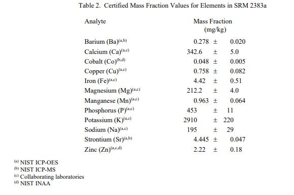 表 3 至 6 提供了 SRM 2383a 中其他分析物的參考質(zhì)量分?jǐn)?shù)值,按原樣報(bào)告。NIST 參考值是非認(rèn)證值,是基于真實(shí)值的最佳估計(jì)關(guān)于可用數(shù)據(jù);但是,該值不符合 NIST 標(biāo)準(zhǔn)認(rèn)證 [1] 并且提供的不確定度可能僅反映測(cè)量再現(xiàn)性,可能不包括所有不確定性來(lái)源,或者可能反映多種分析方法之間缺乏足夠的統(tǒng)計(jì)一致性。參考質(zhì)量分?jǐn)?shù)值來(lái)自 NIST 和/或合作實(shí)驗(yàn)室報(bào)告的結(jié)果。