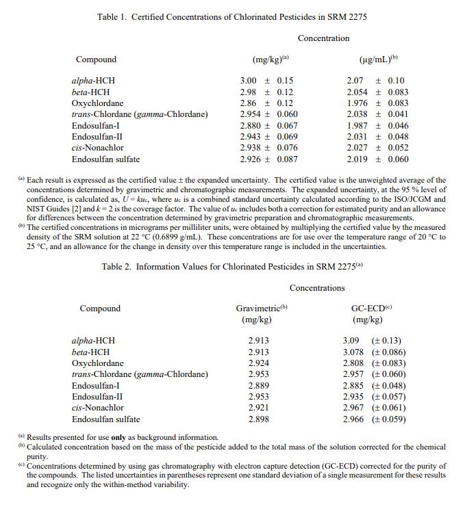 表 1 給出了八種農(nóng)藥的認(rèn)證濃度值,以質(zhì)量分?jǐn)?shù)表示。這些值基于該溶液的重量法制備結(jié)果和使用氣相色譜法確定的分析結(jié)果。 NIST 認(rèn)證值是 NIST 對(duì)其準(zhǔn)確性的最高置信度,即所有已知或可疑來源的NIST [1] 已經(jīng)調(diào)查或解釋了偏差。被測(cè)量列在表 1 中,認(rèn)證值在計(jì)量上可追溯到 SI 派生的質(zhì)量分?jǐn)?shù)單位,以毫克/千克表示。