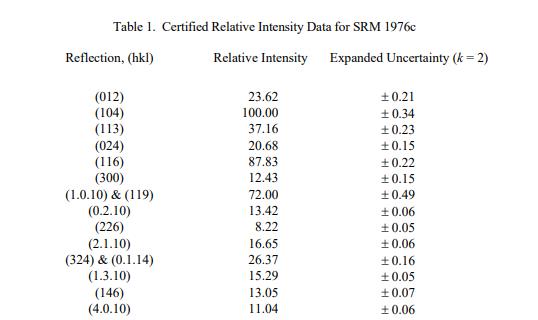 NIST 認(rèn)證值是 NIST 對(duì)其準(zhǔn)確性有最高置信度的值,因?yàn)樗幸阎蚩梢傻钠顏?lái)源都已被調(diào)查或考慮在內(nèi)。被測(cè)量是表 1 中所示的相對(duì)強(qiáng)度(無(wú)量綱比)的認(rèn)證值,以及表 2 中所示的晶格參數(shù)。計(jì)量溯源性是國(guó)際單位制 (SI) 單位,相對(duì)強(qiáng)度值是維度為一,對(duì)于晶格參數(shù),維度是長(zhǎng)度(以納米表示)。認(rèn)證值和不確定度是根據(jù) ISO/JCGM 指南 [1] 中描述的方法計(jì)算的。