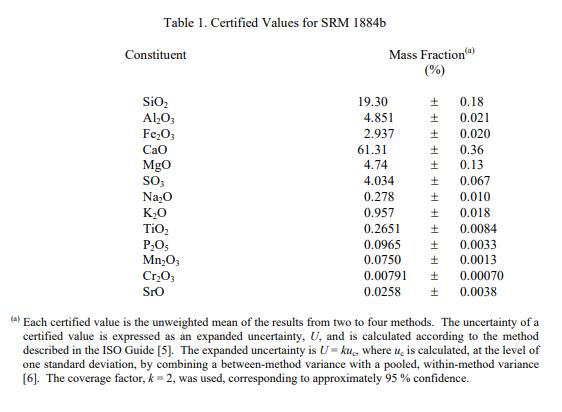 SRM 1884b 中 13 種成分的認(rèn)證值在表 1 中報(bào)告為收到時(shí)的質(zhì)量分?jǐn)?shù) [1]。 NIST 認(rèn)證值是 NIST 對其準(zhǔn)確性有最高置信度的值,因?yàn)樗幸阎蚩梢傻钠顏碓炊家驯徽{(diào)查或考慮在內(nèi) [2]。認(rèn)證值是根據(jù) NIST 和合作實(shí)驗(yàn)室使用附錄 A 中列出的儀器和經(jīng)典測試方法進(jìn)行的分析結(jié)果對真實(shí)值的當(dāng)前最佳估計(jì)。