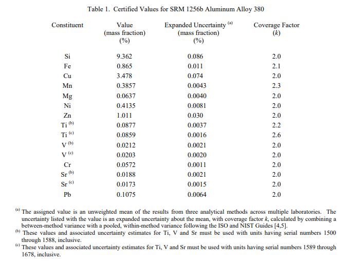 SRM 1256b 中 12 種元素的認證值列于表 1。用戶應(yīng)注意,Ti 給出了兩個認證值,V 給出了兩個認證值,Sr 給出了兩個認證值。SRM 1256b 的每個單元都帶有一個序列號。 Ti、V 和 Sr 的正確值是與設(shè)備序列號相關(guān)的值。兩種元素的參考值列于表 2。對于所有元素,值均以質(zhì)量分數(shù)報告 [1]。賦值類別基于 NIST 用于化學參考材料 [2] 的術(shù)語和模式的定義。